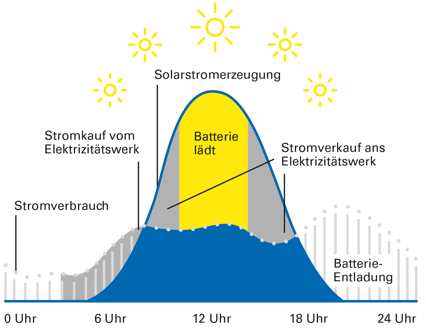 Mit dem Batteriespeicher scheint für Sie die Sonne auch in der Nacht. Die tagsüber überschüssige Energie wird kurzzeitig zwischengelagert und in der Nacht oder bei schlechtem Wetter wieder ohne «teuren» Netzbezug abgerufen.