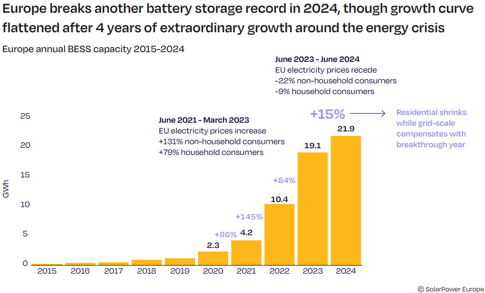 Seit 2020 verdoppelt dich der jährliche Zubau von Batteriespeichern in Europa. Im Jahr 2024 wurde eine Kapazität von knapp 22 GWh installiert.